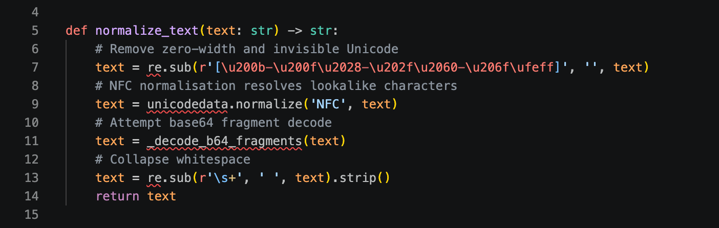 Only normalised text reaches the detection layers. An attacker who bypasses pattern matching with Unicode tricks does not get past normalisation.