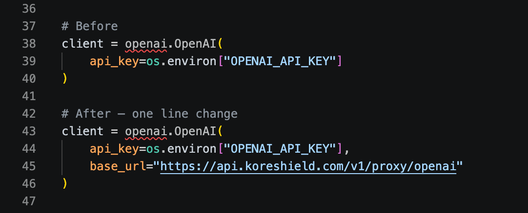 Integration is a single endpoint change. Replace your LLM provider's base URL with the KoreShield proxy endpoint:
