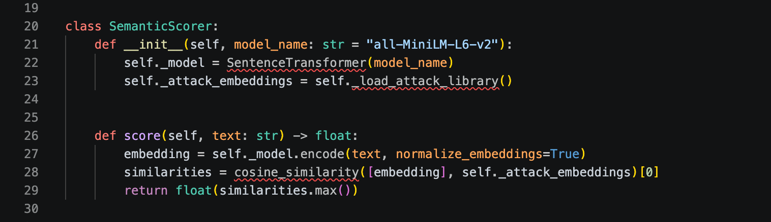 The scorer embeds the normalised input and computes cosine similarity against a library of known attack embeddings: